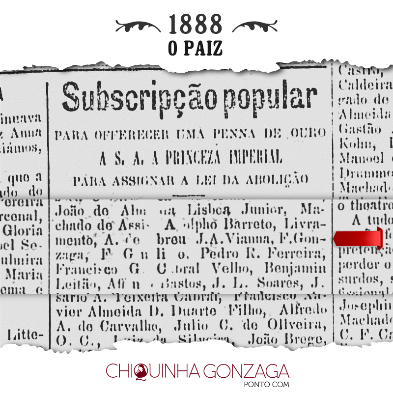 O periódico O PAIZ, RJ, de 12 de maio de 1888 relaciona assinaturas, inclusive de F. Gonzaga (Chiquinha Gonzaga), de Subscrição Pública para oferecer uma pena de ouro a S. A. A PRINCESA IMPERIAL (Princesa Isabel) para assinar a Lei da Abolição (Lei Áurea).