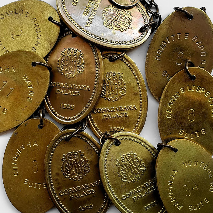 Chaveiros do Copacabana Palace, material bronze, os chaveiros circularam desde o ano de 1923 até meados dos anos 90, além do chaveiros comuns com somente os números dos quartos, escrito suítes, também incluem chaveiros de cassino, bife de ouro, croupier, suite presidencial, suíte Royal, piscina, theatro, os chaveiros também contém os nomes de personalidades conhecidas que foram convidadas ou se hospedaram no hotel.